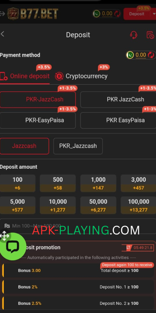 B77 Bet game gives one of the smoothest payment methods like jazz cash and easy paisa which are safe, secure and fast transactions.